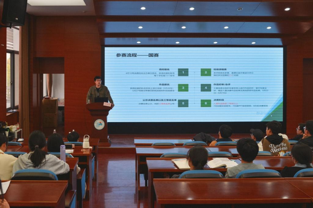 刘润东主要从全国大学生节能减排社会实践与科技竞赛的组织形式、参赛流程、专业知识、经验分享等内容进行深入宣讲。