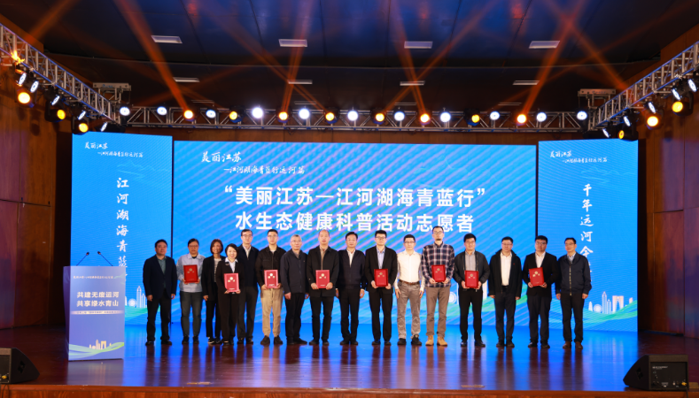 现场,与会领导为8位“美丽江苏—江河湖海青蓝行”水生态健康科普志愿者颁发聘书,勉励他们以榜样之姿,持续担当运河生态的守护者。