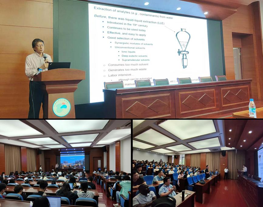 报告主要围绕液液萃取技术(LLE)的建立与发展,重点介绍了其在高萃取效率、低溶剂消耗和良好选择性等方面的研究进展,并就关键技术改进与创新成果进行了深入探讨。李教授还详细分析了该技术在微型化、绿色化方向的发展趋势。近年来,通过引入中空纤维、纳米材料等新型支撑介质,液液萃取在萃取模式、材料选择及操作方式等方面不断优化,显著提升了萃取效率与稳定性,推动了其在微型化平台中的应用。此外,该技术正逐步与自动化系统融合,构建起实时、在线的污染物监测体系,在环境安全、食品安全及临床诊断等领域展现出良好的应用前景。报告结束后,李教授与现场师生展开了热烈交流,针对大家提出的问题逐一细致解答,并结合自身科研经历分享了宝贵的研究思路与学术见解,现场气氛活跃,与会师生受益良多。