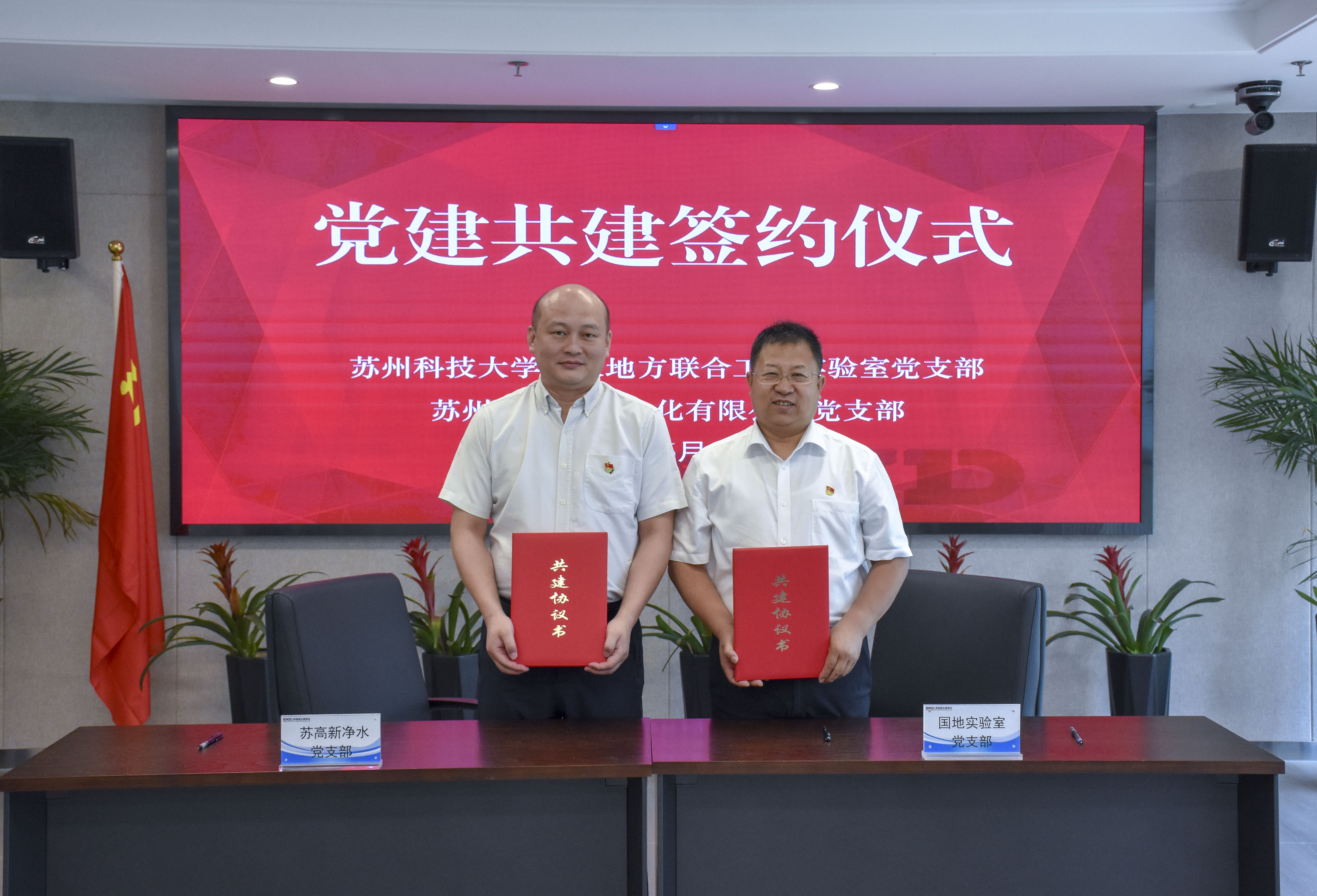 双方就党建共建、人才培养、项目合作和资源共享等议题进行了深入探讨。李大鹏、卢军辉分别代表环境学院国家地方联合工程实验室党支部和苏州高新水质净化有限公司党支部,共同签署了党建共建协议。潘杨代表学院为企业授牌“环保小院”。