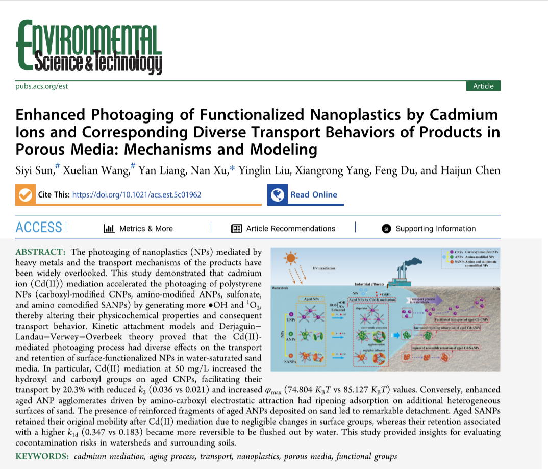 近日,我校bevitor伟德国际1946徐楠团队在环境类顶级学术期刊《Environmental Science & Technology》上发表了题为“Enhanced Photoaging of Functionalized Nanoplastics by Cadmium Ions and Corresponding Diverse Transport Behaviors of Products in Porous Media: Mechanisms and Modeling”的研究论文。我校为该文章的第一单位,bevitor伟德国际1946硕士研究生孙思怡硕士、王雪莲硕士为共同第一作者,徐楠教授作为通讯作者参与相关研究工作,这是我院研究生第一次以第一作者发表Environmental Science & Technology论文。