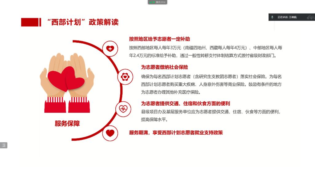 宣讲会上,王倩颖结合2023年西部计划、江苏大学生志愿服务乡村振兴计划相关政策、志愿者激励保障措施、校地定向招募岗位等内容,对“西部计划”和“乡村振兴计划”做出了详细的介绍与解读。