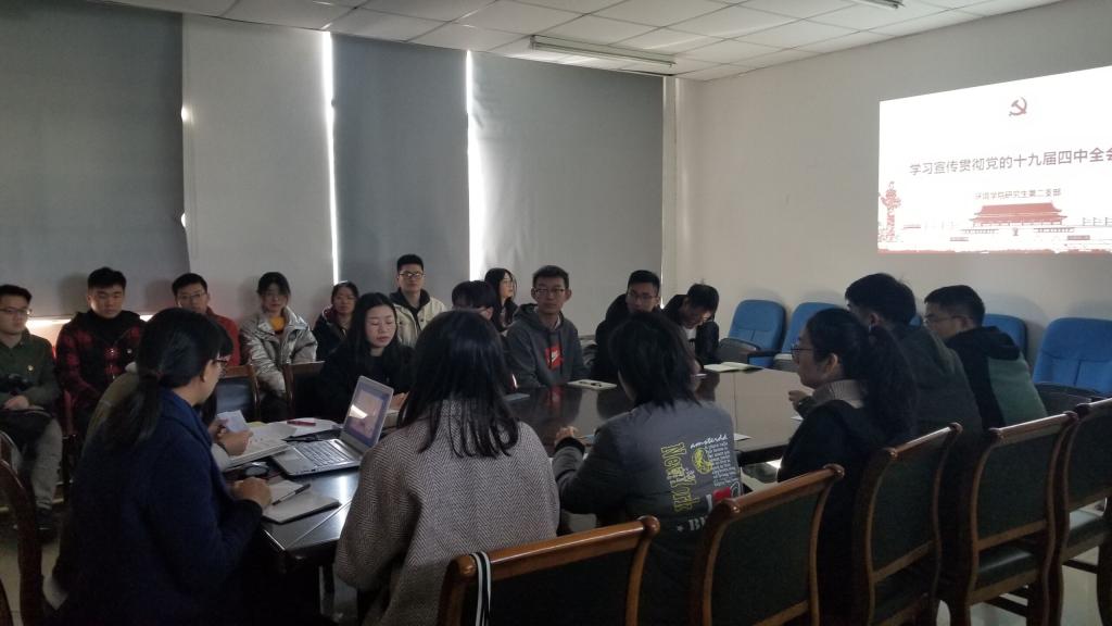 11月28日上午,环境学院研究生第二党支部在环境楼A205召开专题学习会,组织学习党的十九届四中全会精神,全体支部党员参加了会议。