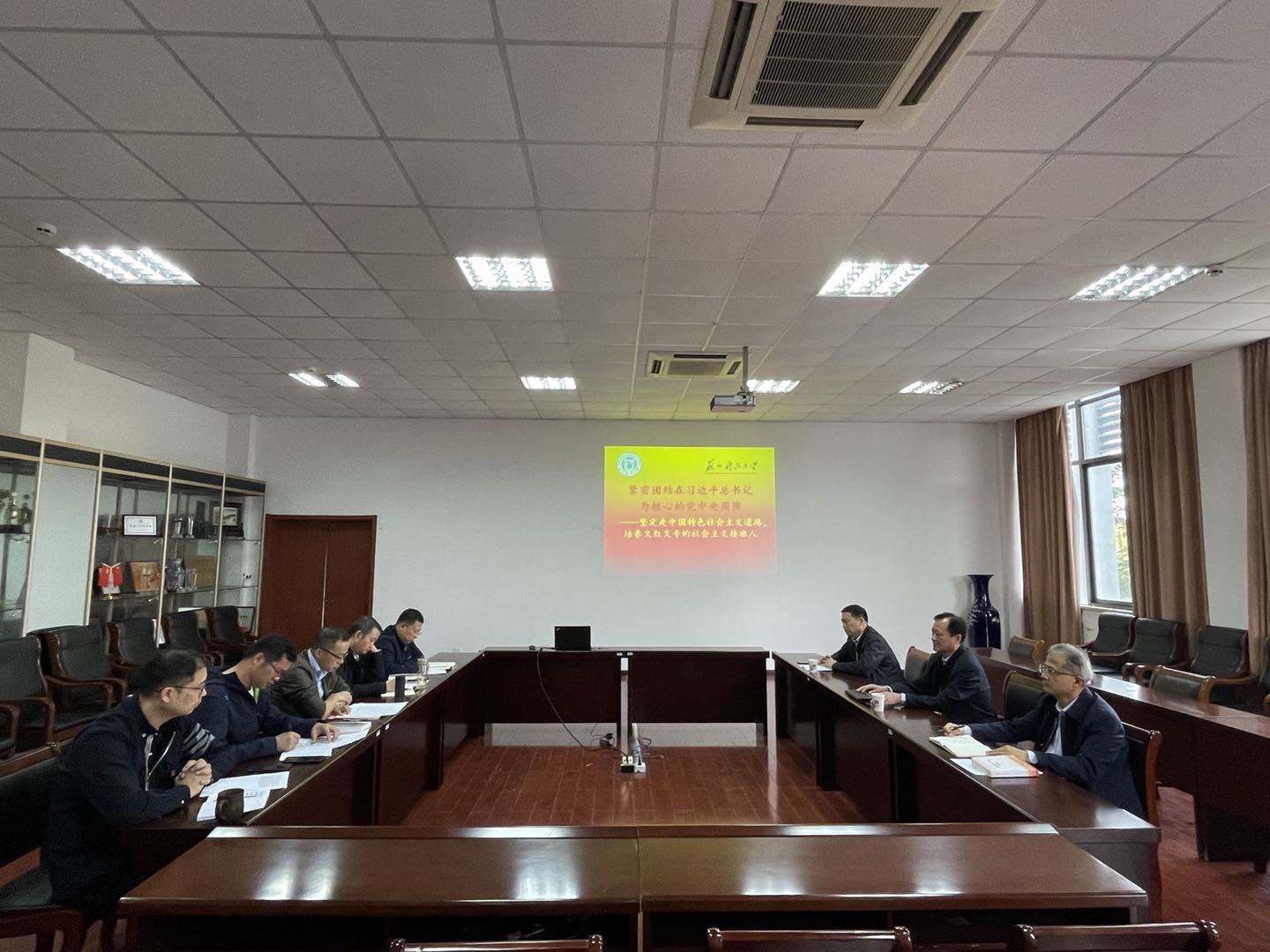 费忠民领学《中国共产党简史》——党的十八大和实现中华民族伟大复兴的中国梦。学院中心组其他成员分别围绕党的十八大以来,我国经济建设、政治建设、文化建设、社会建设以及生态文明建设五个方面的重大成就,结合实际工作进行交流发言,大家一致认为,要紧密团结在以习近平同志为核心的党中央周围——坚定走中国特色社会主义道路,培养德智体美劳全面发展的社会主义的建设者和接班人。